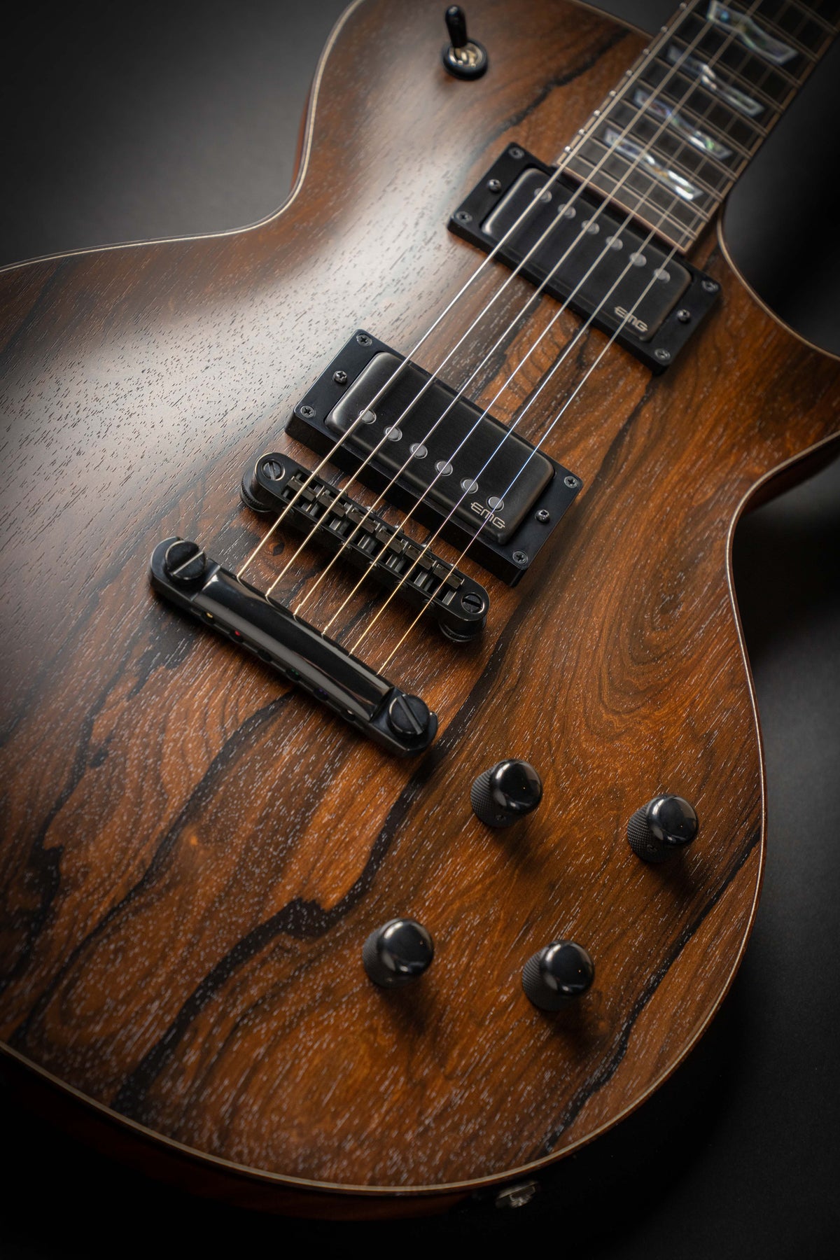 Pour ce modèle Master Built, nous avons sélectionné parmi les plus beaux bois disponibles sur le marché. Cette EC-CTM bénéficie d'un corps et d'un manche set-thru en acajou du Honduras et d’une touche en ébène du Gabon. Une superbe table en Ziricote est matchée avec un dos ultra figuré. Les inlays sont réalisés en acier Damascus et Abalone. Corps léger, confort exceptionnel, accès aux aigus d’une facilité déconcertante : cette Eclipse séduit par sa jouabilité et sa beauté brute. Elle est équipée de micros EMG JH taillés pour le gros son. Cette guitare est une pièce unique au monde, qui ne sera pas reproduite.