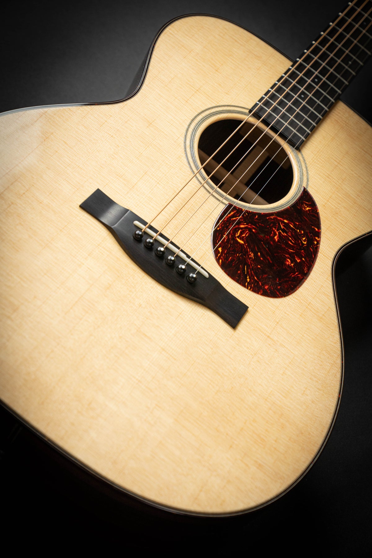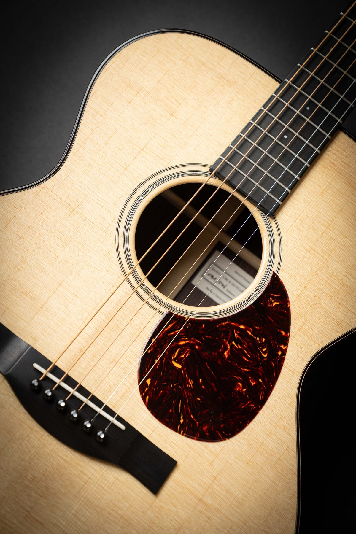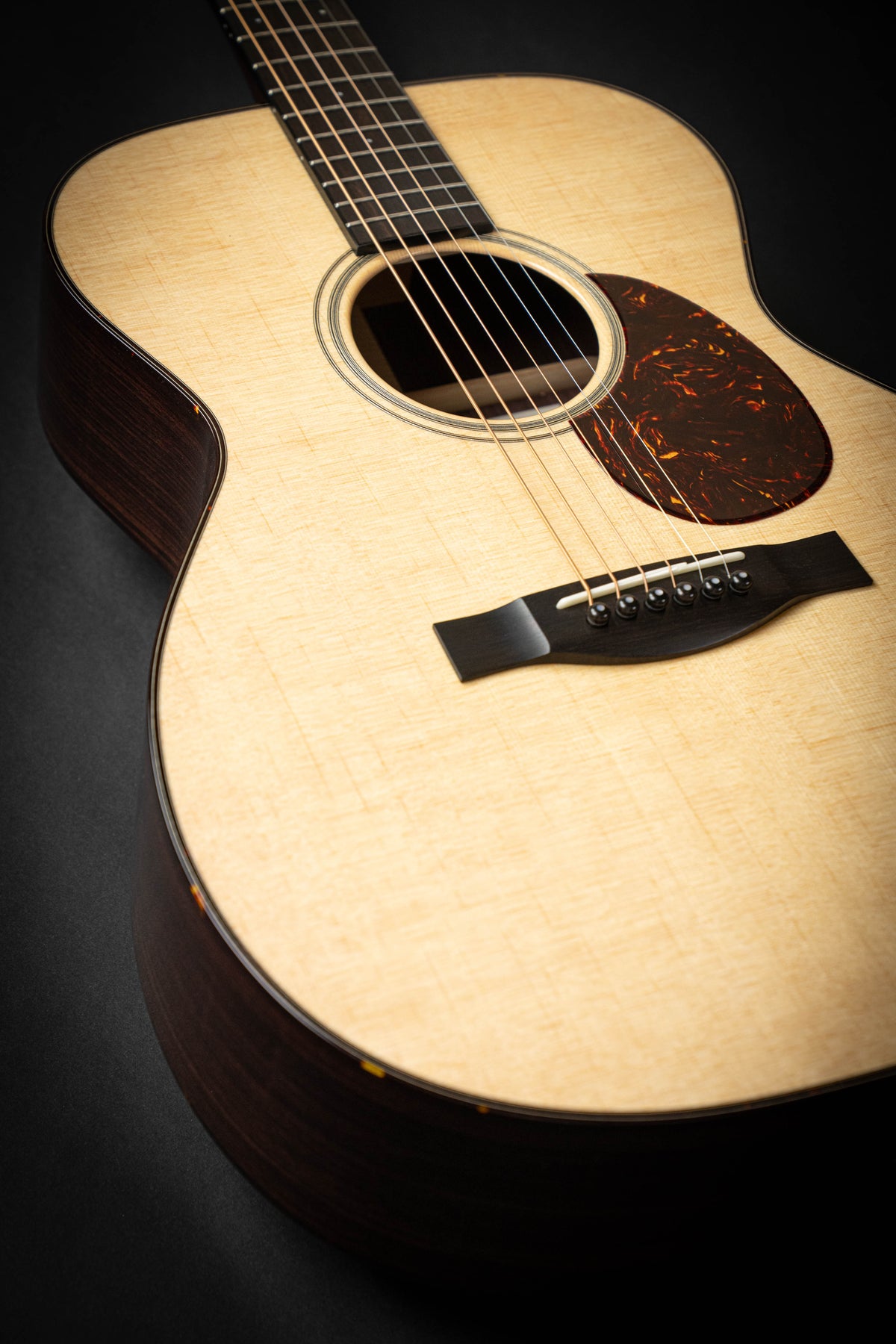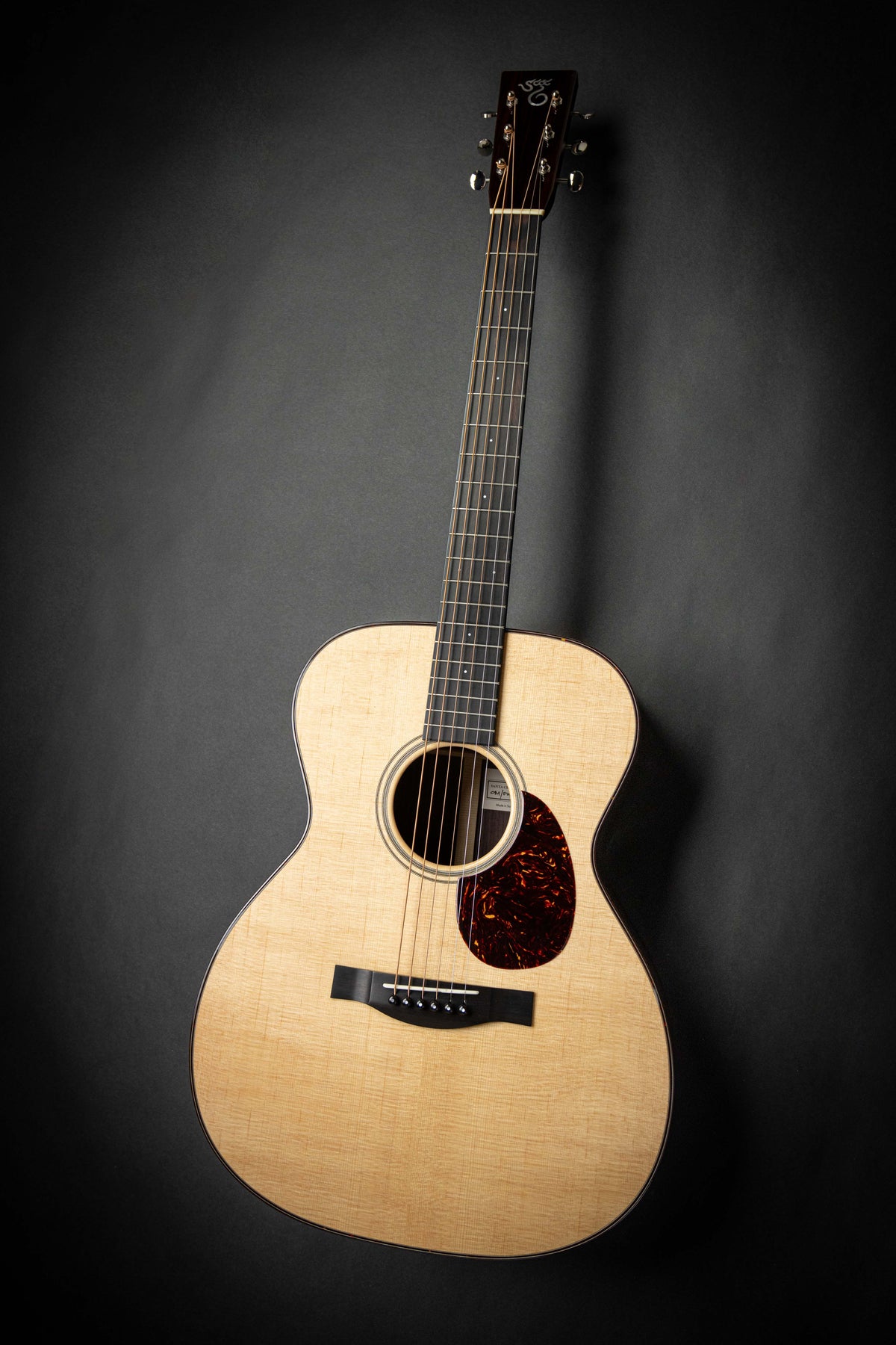 Cette OM Custom bénéficie d’une construction réalisée autour d’une table en épicéa de Sitka et d’un fond et d’éclisses en palissandre indien. Un binding tortoise custom vient souligner la beauté de ses lignes. La rosace est soulignée d'un liseré qui ajoute une touche classique en toute sobriété. Le manche reprend le design traditionnel des guitares pre-war. Un profil en V très confortable, associé à une touche en ébène dotée d’incrustations dots 2mm en MOP, assure une jouabilité toute en douceur. Cette combinaison délivre des sonorités parfaitement équilibrées.