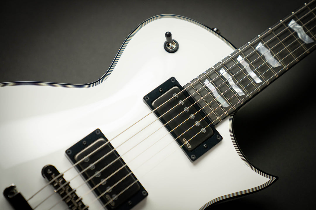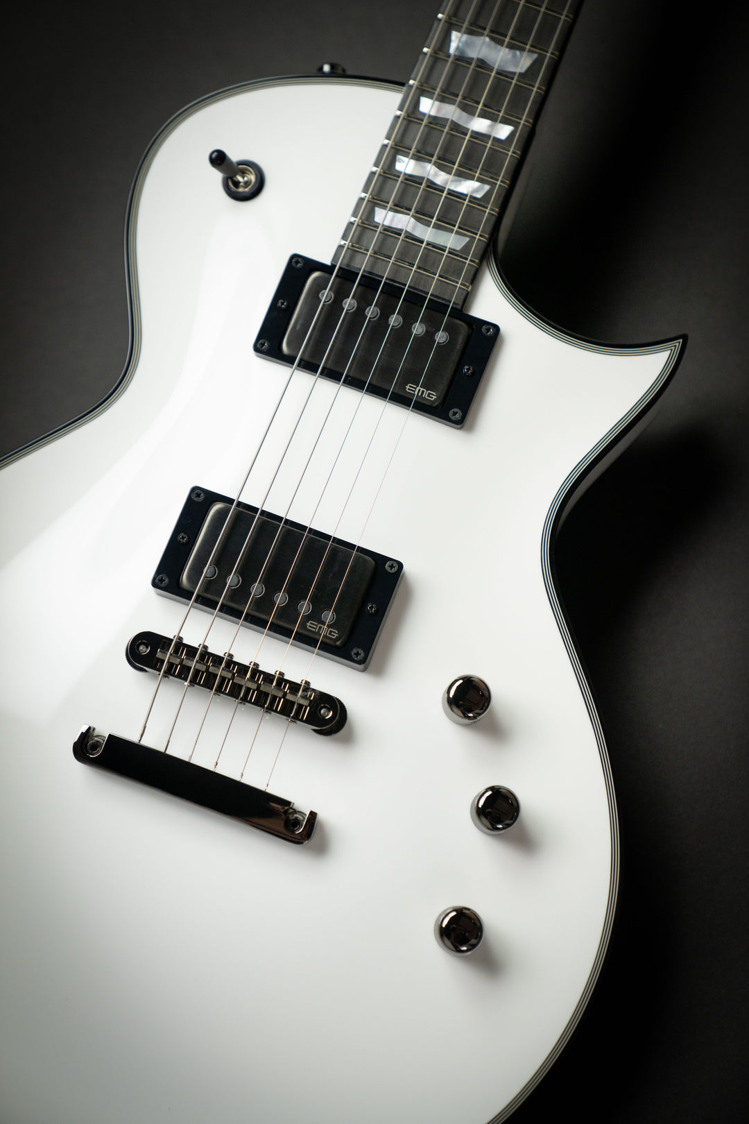 The ESP EC-CTM is built around a Honduran mahogany body combined with a maple top. The neck, also made from Honduras mahogany, has an ebony fingerboard and benefits from a set-neck type junction. It is presented in Snow White finish and equipped with an EMG JH (James Hetfield) pickup kit which is a reference in terms of big sound at the moment.