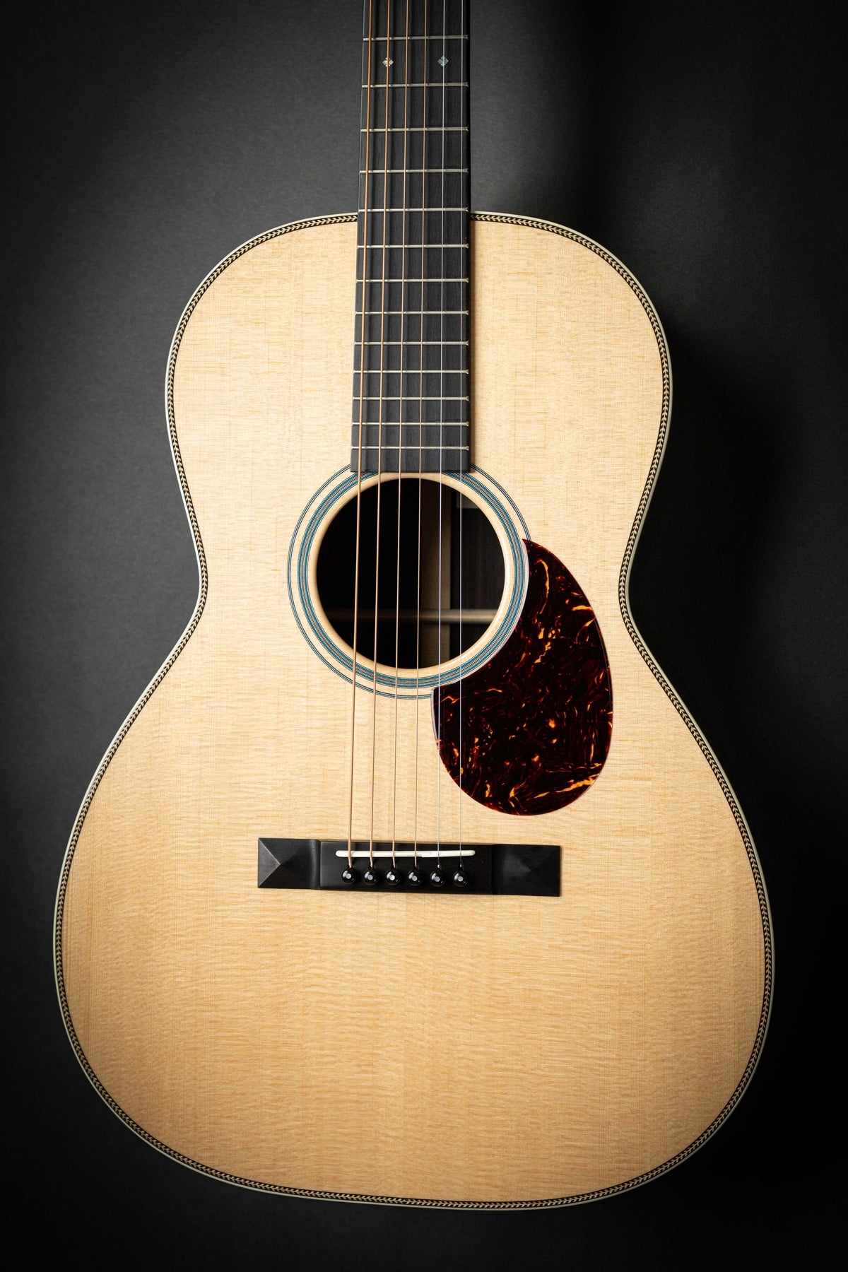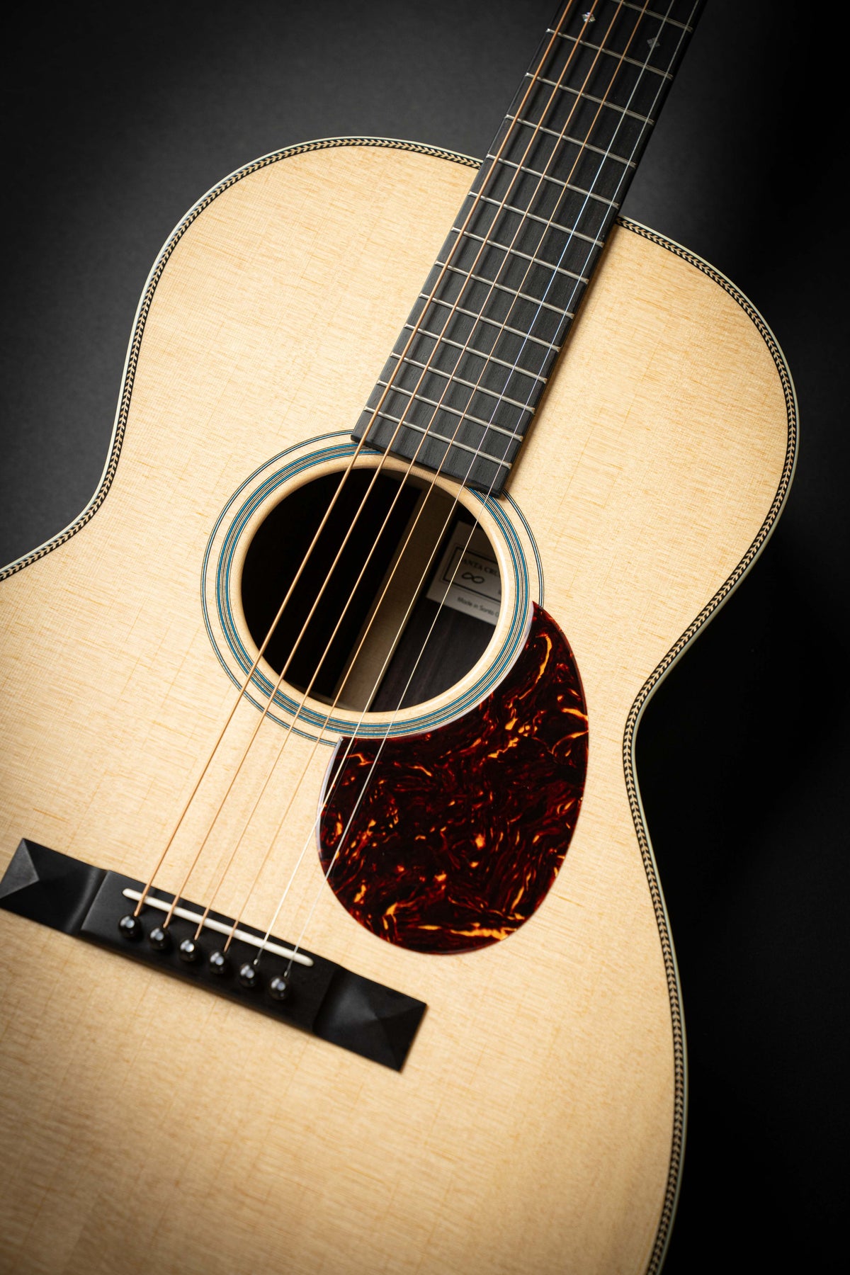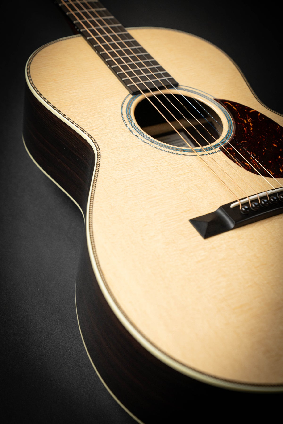 This 00 Custom features a construction built around a Sitka spruce top and Indian rosewood back and sides. Ivoroid and herringbone binding highlights the beauty of its lines. The Blue Purfle Combo rosette adds a classic touch in all its sobriety. The neck adopts the traditional design of pre-war guitars. A very comfortable V-shaped profile, combined with a fingerboard ebony neck with Diamond Squares MOP inlays, ensures smooth playability. This combination delivers perfectly balanced tones.
