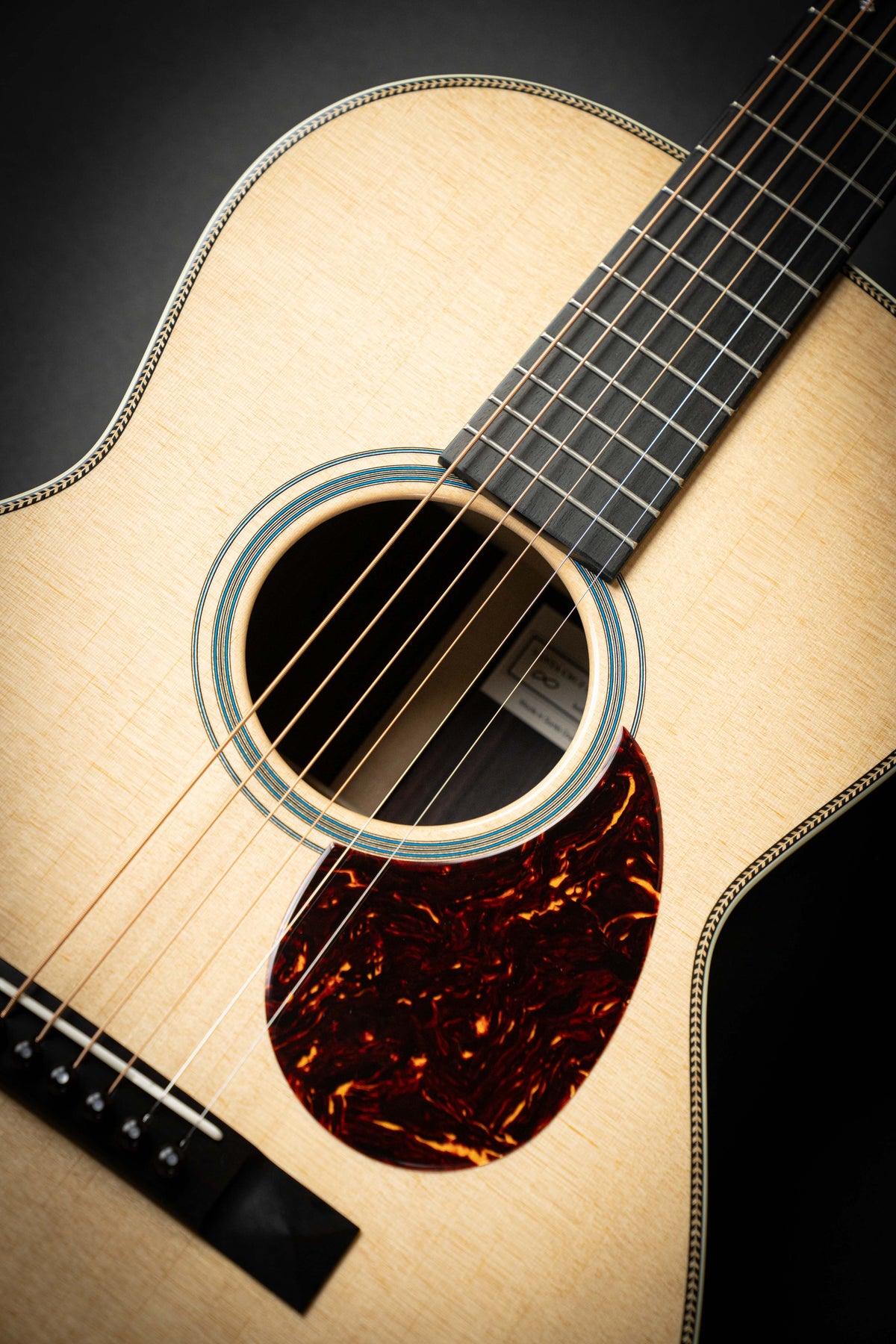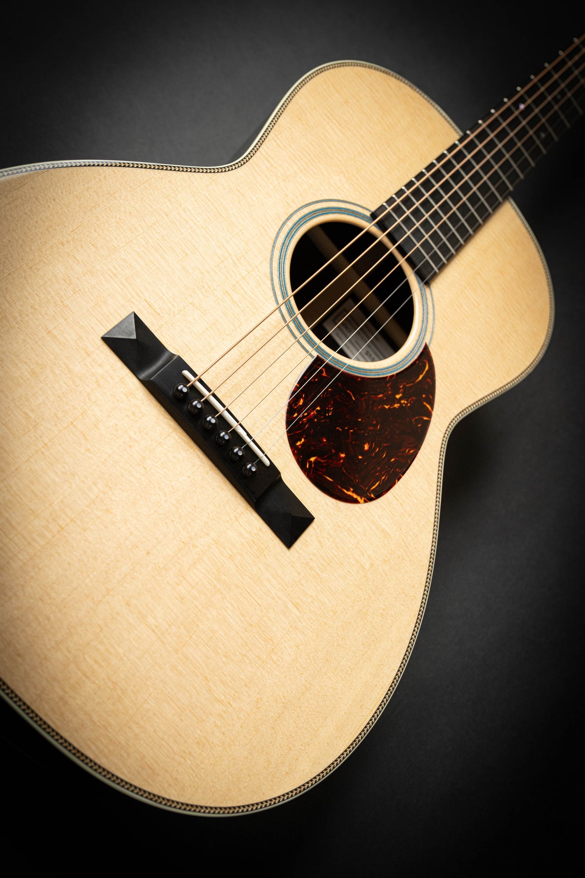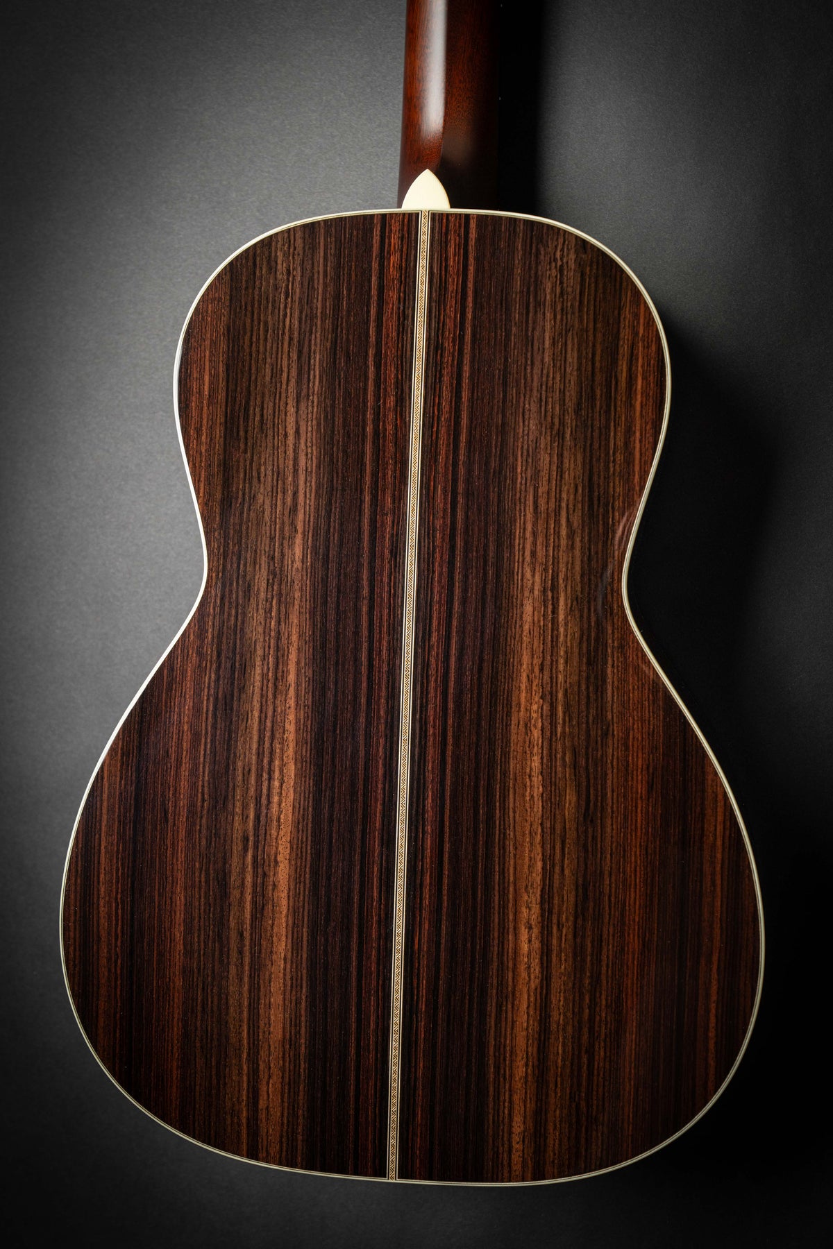 This 00 Custom features a construction built around a Sitka spruce top and Indian rosewood back and sides. Ivoroid and herringbone binding highlights the beauty of its lines. The Blue Purfle Combo rosette adds a classic touch in all its sobriety. The neck adopts the traditional design of pre-war guitars. A very comfortable V-shaped profile, combined with a fingerboard ebony neck with Diamond Squares MOP inlays, ensures smooth playability. This combination delivers perfectly balanced tones.